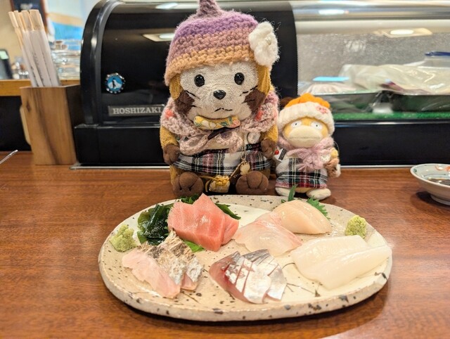 お刺身盛り合わせ(バチマグロ中トロ、太刀魚炙り、アジ、ヒラメ、ホタテ、ヤリイカ)