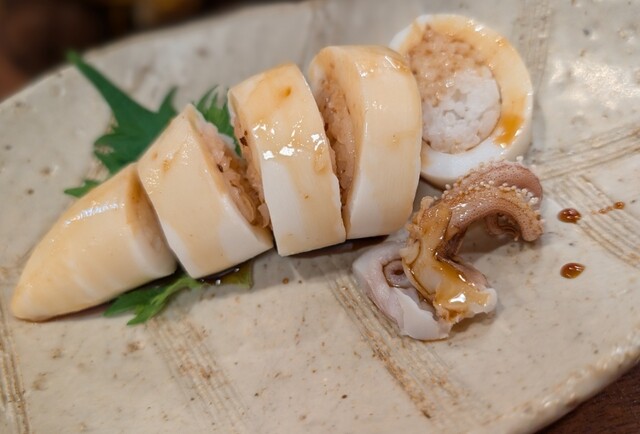 イカ飯とはまた違って、柔らかいヤリイカの身に酢飯が詰められ、甘辛いタレがまた美味ー♡