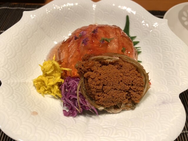 久しぶりに月岡温泉の別邸越の里さんに伺いました。夕食は個室でいただきました。先付けは、野菜、りんごに海苔のジュレがかかっているものです、海苔のジュレがとても美味しい。そして吸い物です、蛤の真丈に若芽筍...