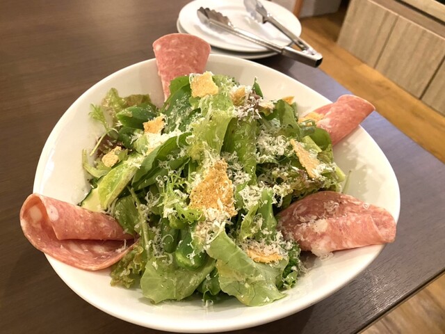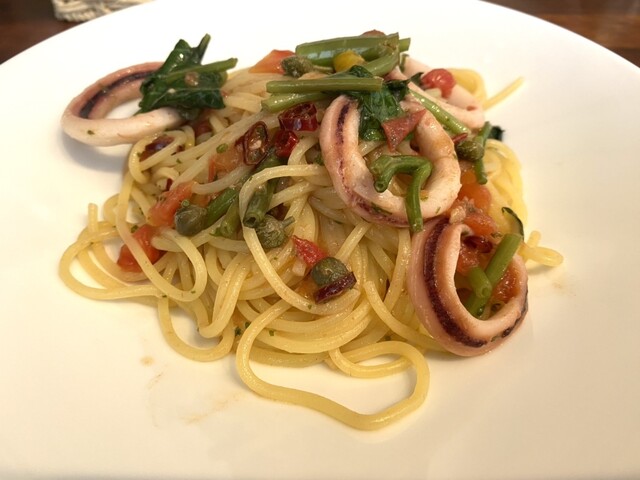 自家製パンチェッタ、きのこ、小松菜、アーモンドのオイルソース生スパゲッティ