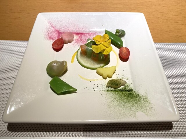 季節の一品=シルクサーモンと早蕗のシャルロットで、サッパリして美味しいです。