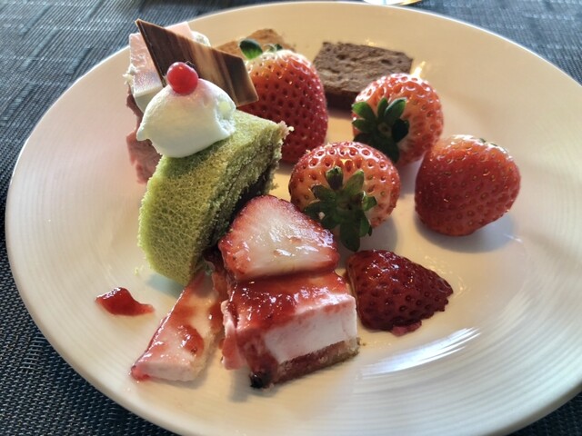 スープは、カリフラワーのポタージュのなんとも包み込むような甘さがホッとする。パートナーのブイヨンは、もうアサリがガッツリ香る海鮮好きなパートナーには堪らなかったようです。メインの四万十鶏は、柔らかくてジューシーでマスタードソースつけまくりでペロリ〜。はちきん地鶏の方はパテになっててくつね感があってほろほろと崩れる感じ。味はしっかりしててなにもつけずにいただけました。何よりパンが美味しい〜しかも焼きたてほやほやで熱々!そして!ここからが本番。とちあいか、とちおとめ、あまおう、紅ほっぺ食べ比べは、おそらく2人で70個くらい食べたその他のスイーツもほぼ制覇!