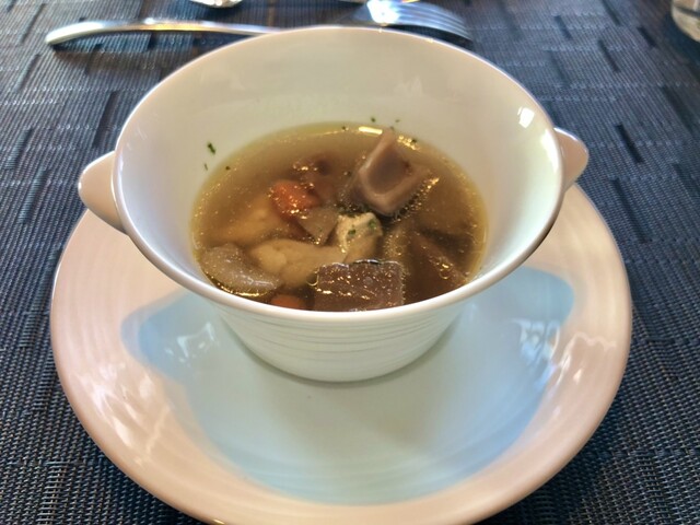 スープは、イベリコ豚と根菜のブイヨンスープ、