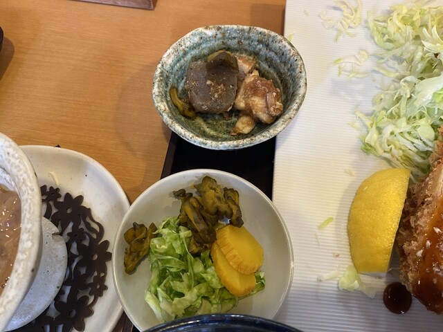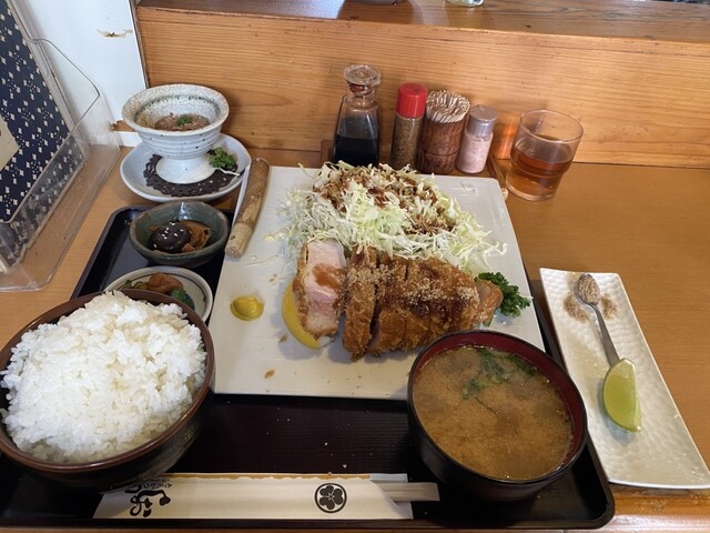 ぶ厚いロースかつ。山盛りのキャベツ。具沢山の豚汁。美味しかったです。