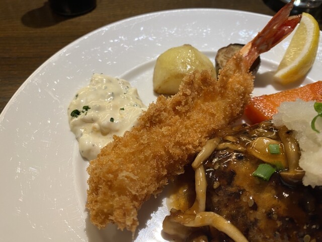 ハンバーグにエビフライを追加しましたがハンバーグは肉汁、肉質、ソース、そしてハンバーグとしての完成の旨み全てが満点です