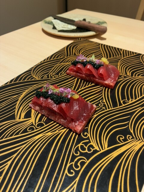 ■ 和牛と本鮪のユッケドッグ〜とろたく仕立て〜 (雲丹ユッケドッグから変更) 炙った海苔の香ばしさに、和牛と本鮪の旨みが見事に調和。 薄く削られた昆布の旨みが全体をまとめていて、新しい一体感を感じる贅沢な一品。