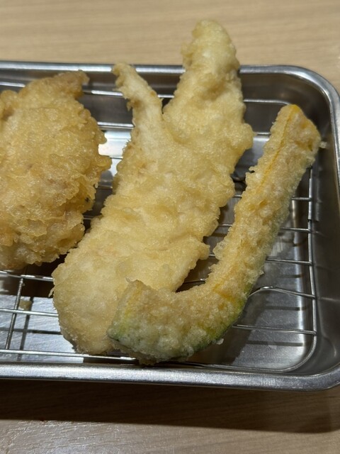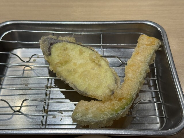 いつものとり天定食(1,240円)に定食ごはん大盛(50円)、そして今回は焼き芋の天ぷら(130円)も注文。