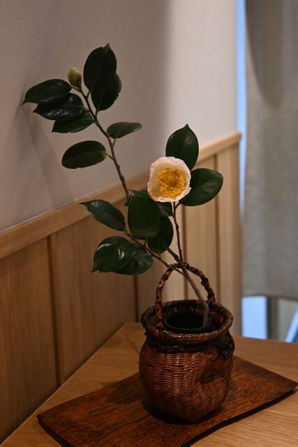 新年の挨拶に迎えられると、そこには変わらぬ清潔さと、凛とした静謐な空気が満ちていました。カウンターに活けられた一輪の白い椿。目隠しを施し、より端正に整えられた水回りの設え。その慎ましやかな佇まいに、こちらの心まで洗われていくようです。