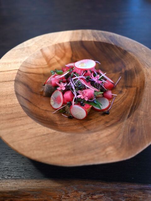 季節野菜のスペシャリテの一皿はもちろんですが、オリーブの葉を食べさせた鰤とビーツに付けた大根の辛みの組合せ。手間暇をかけて巻いた蕪に隠さた蟹の焼き身、もちもちパスタの食感に注がれる蟹の出汁の風味。ローストした経産牛のもも肉に添えられた酢漬けしたキャベツとミンチの熱々ロールキャベツの対比などなど。