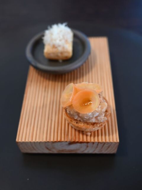 じゃがいものコロッケ、メレンゲに乗った紅ズワイガニが桜をイメージさせます