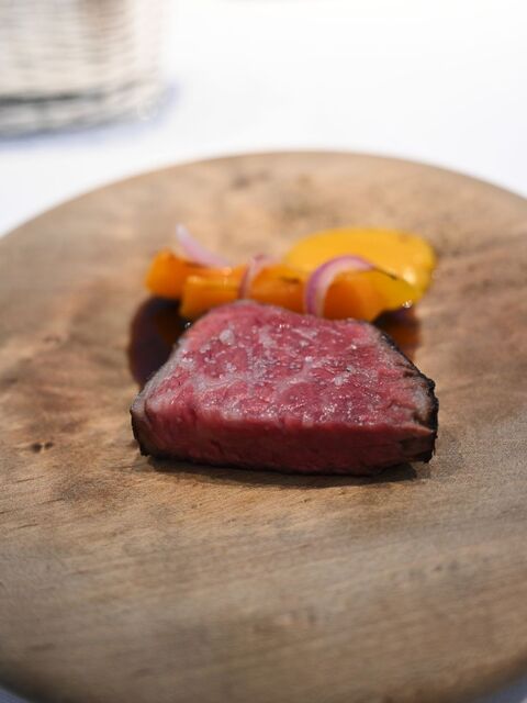 メインは近江牛。付け合わせに南瓜の一種であるコリンキーが添えられ、バターナッツカボチャの濃厚なソースと牛の出汁と合わせた赤ワインソースと共に味わいます。