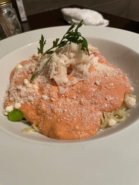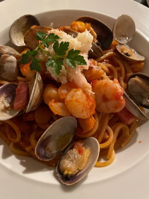 スパゲッティは、毎度食べログで報告済みですが、いつも茹で加減が最高です。もちもち、ぷりぷりのパスタにGAKU特製のトマトソースが絡んだだけでも絶妙な味加減に満足出来るのですが、エビや小柱といったシーフードがこれでもかというほど入っていて、ボリューム感、満足感もさることながら、口内で様々な歯応え、感触を味わえ、正に口福です。