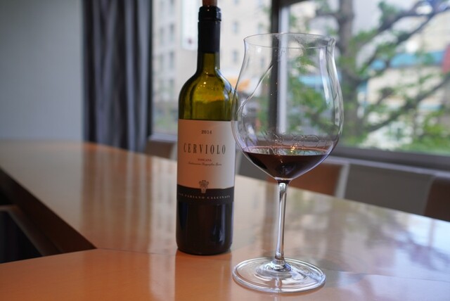 最後のパスタを待つ間、支配人はイタリア トスカーナのチェルヴィオーロ 赤 2014年をオールドリーデルと共にお持ち下さいました。