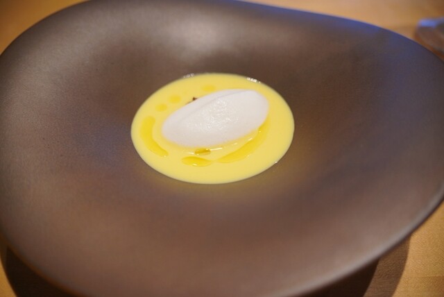 そら豆のペーストを軸に後からケールの優しい苦味がくる感じですが、あおさ?も入っているのか、マツカワの脂とあおさの旨み、ケールの苦味、そら豆の滑らかさが一体感を持って口の中に広がります。そら豆はペースト状ですが、つぶも残しており歯応えの変化も楽しめます。とても美味しかったです。