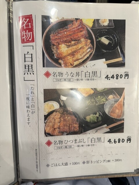 最初は最も安い3,000円弱のうな丼にしようとしたのですが、メニューを見たところ、うな丼「白黒」を見つけ、「そういえば、白焼きはあまり食べたことがないな。なかなか食べる機会もないし、両方食べれるならこれにするか」と、こちらをチョイス。