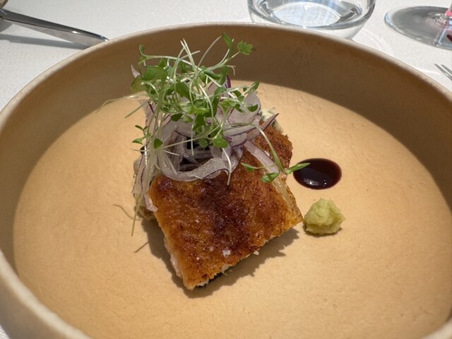 揚げたようにパリパリの鰻の火入れ。なめろう、鰻の脂とクセの少ないフルム・ダンベールのブルーチーズの相性がとっても良くて♡実は鰻は苦手なのですが、この焼き加減と組み合わせ好きだな〜