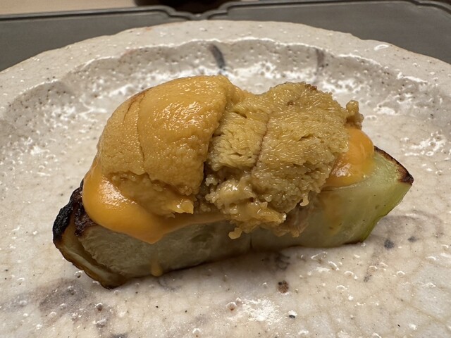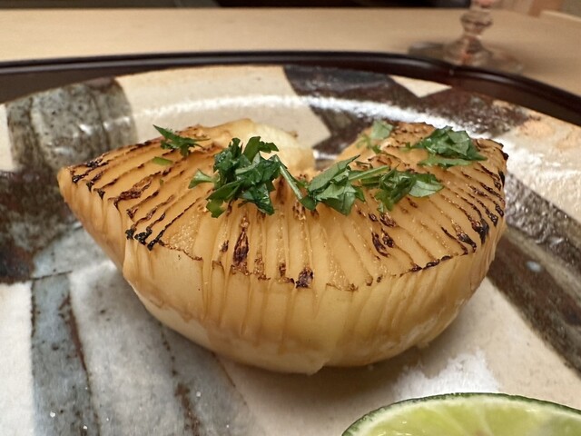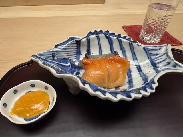 箸でスッと切れるほど滑らかで柔らかく炊き上がった海老芋はお出汁がしみしみ〜煮る→揚げる→炭火で焼く。♾️に食べたい海老芋。ビールにも合いそうです。箸休めの琥珀に切った唐墨もポーションも素敵。