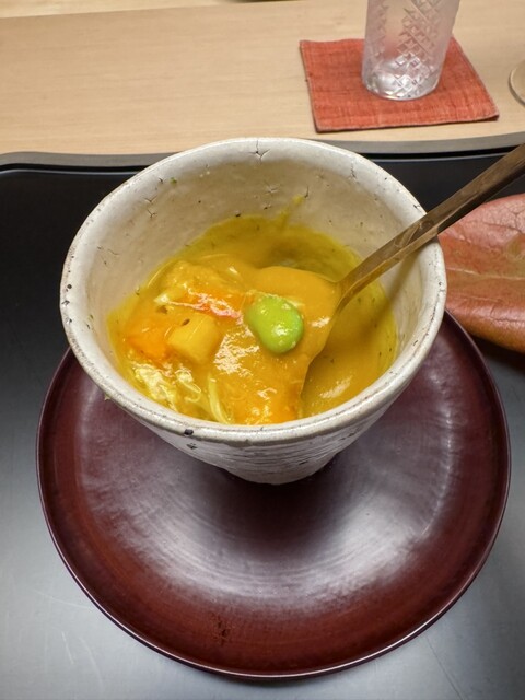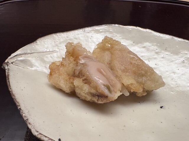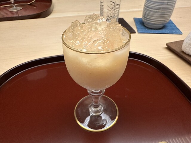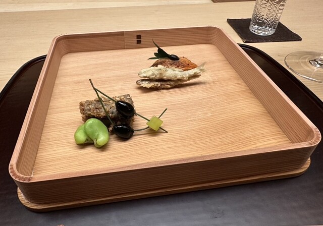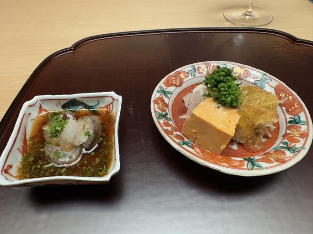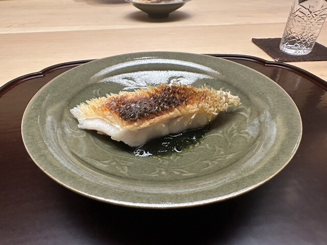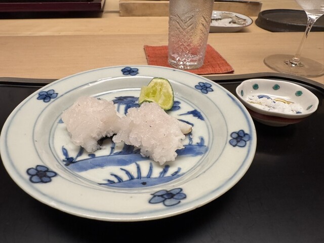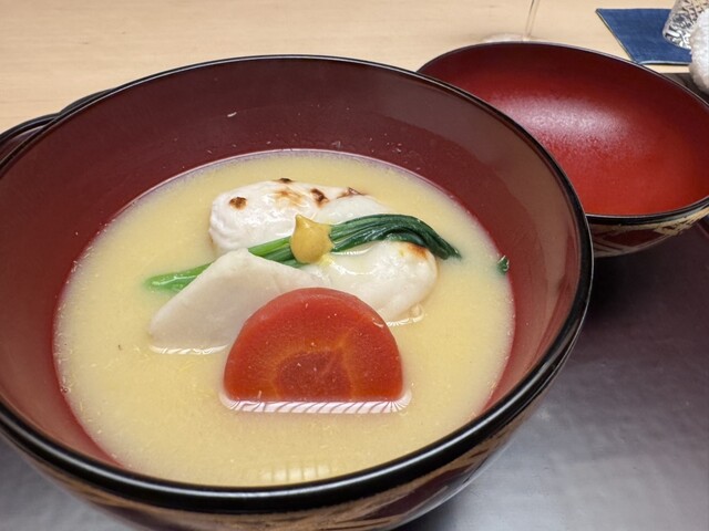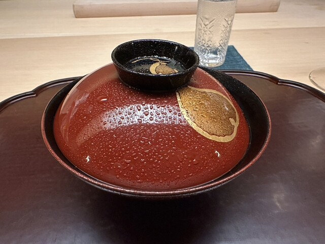 シャープで清らかな利尻昆布の旨味と鰹の旨味と香りが素晴らしいお椀。旨味成分がしっかり抽出されていると感じました。真薯は箸を入れるとほろりと解け、真薯と吸い地の塩分料が心地よかったです。