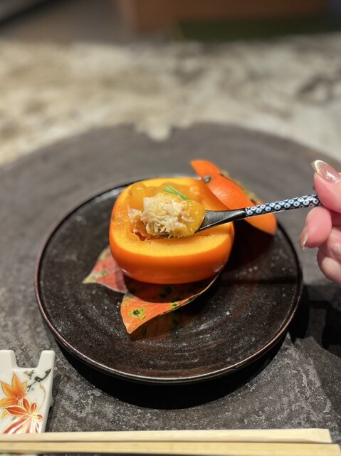→丸ごと一つの柿を使い、中にはぎっしりと詰まった毛蟹が美味しかった。