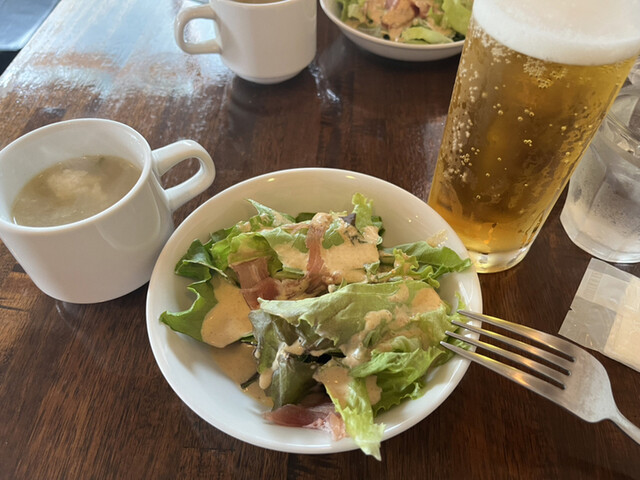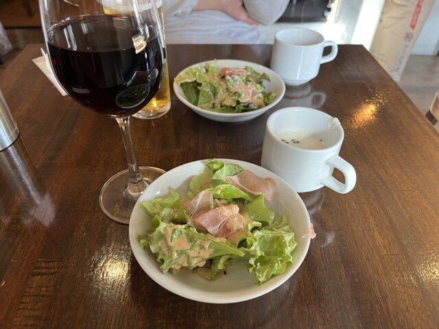 ランチに付くサラダとスープも美味しい。お酒を頼むと、スープはピクルスになります。デザートのティラミス300円も最高。