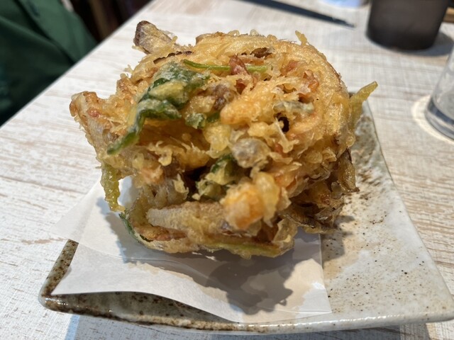 土曜日のお昼に訪問。人気で小さな店内はいつも混んでて中々入れないので、11時半のオープン時間を狙って訪問。おろしそばとミニカツ丼セットと、ざるそばとミニ天丼セット、カキフライ、ごぼう唐揚げ、ハムカツを注文。200円のかき揚げのボリュームにびっくり!全部美味しい‼︎ランチタイムはつまみが揚げ物オンリーなので、次回は夜伺いたい。