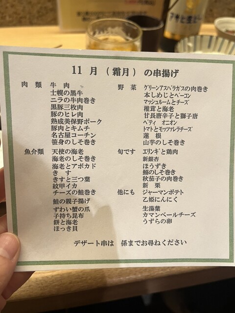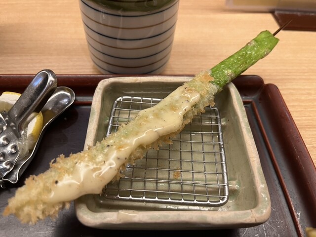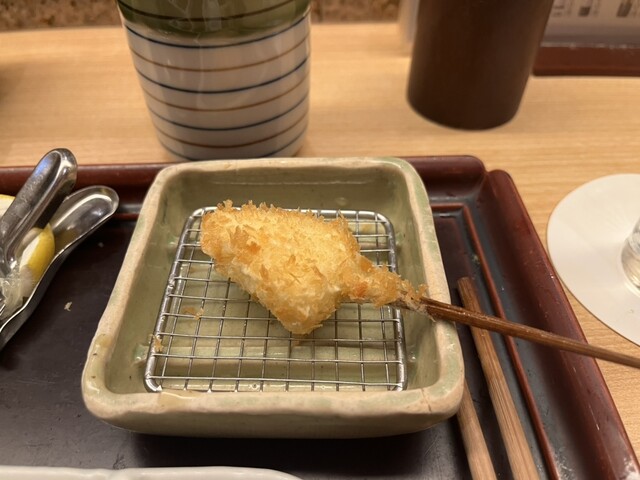 ランチは1400円で串7本セットのみ、一本ずつ揚げ立てを出してもらいながら食べられるのが最高!