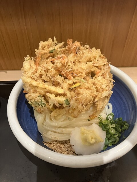 名物のかき揚げおろしうどんを大盛りで注文!中盛までは無料ですが、お腹空いていたので大盛りです!かき揚げのサイズは思ったよりも大きく、丼の半分くらいの面積を占めています。とても箸では持ち上げられません。これだけの大きさなのに中までカラッと揚がっており美味しい!しかも食べ終わってからも胃もたれがないという不思議!良い油を使っていると想定します!