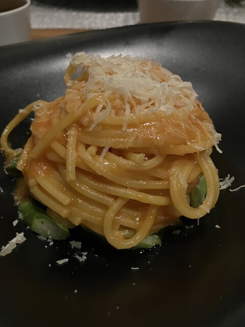 パスタはトマトベースのサッパリとした味わいですが、底にあるバジルソースと合わせると苦味が加わり大人の味わいに!