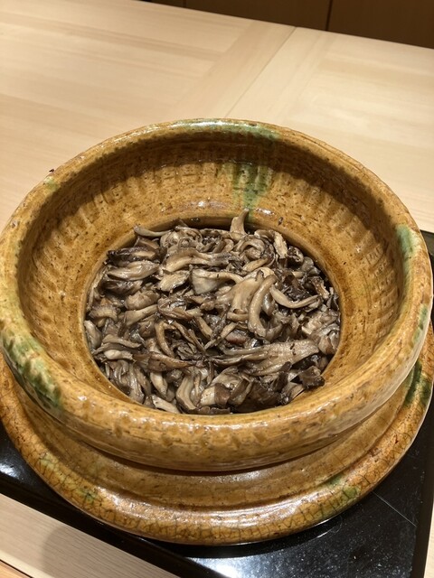 巨大な舞茸を藁で燻した牛肉を混ぜ込んだ土鍋ご飯です!秋を感じる風情のある贅沢です!2杯目は牛出汁とバラ干し海苔、安曇野ワサビを添えてサラサラと頂きました!