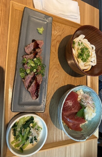 土日祝は食べログで予約できるそうです。平日にはない、限定の松坂牛すき焼き膳をいただきました。松坂牛は鉄板ですね。このお値段でもリーズナブルです。備え付けのお茶もあってうれしいです。店員さんの対応もニコニコして気持ちがいいです。伊勢うどんも食べたくて、聞いたら単品可でお願いしました。もうひとつのざんまい善は、カツオ丼とローストビーフのような松坂牛グリルが付いていて、こちらもおいしかったです。お土産屋さんも併設で買い物しました。