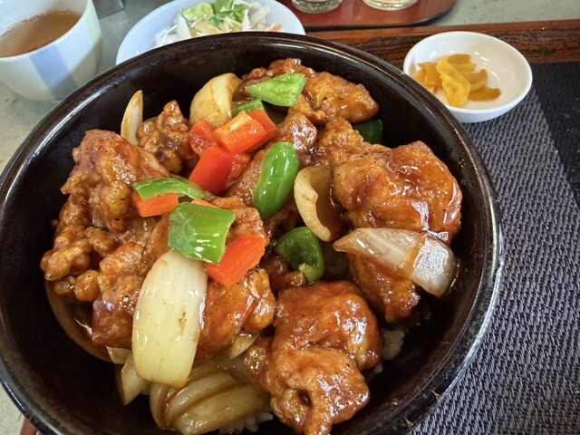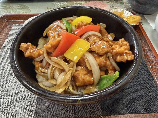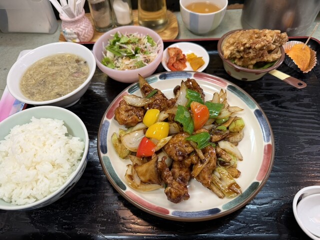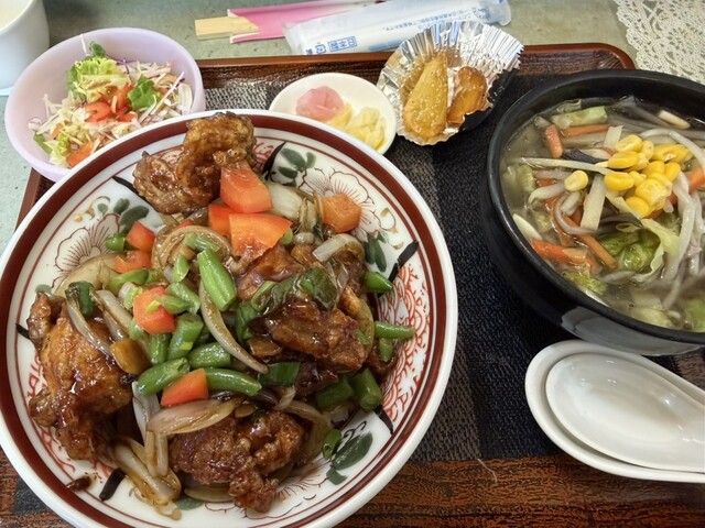 酢豚、棒棒鶏、小天津麺、サラダ、わかめときのこのスープ