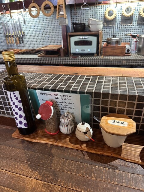 テーブルにある自家製醤油糀や、こだわりのオリーブオイルなどで味わえます。