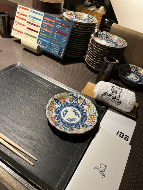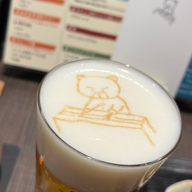 熊の焼鳥の熊くんが泡にプリントされた生ビールで乾杯してから、
