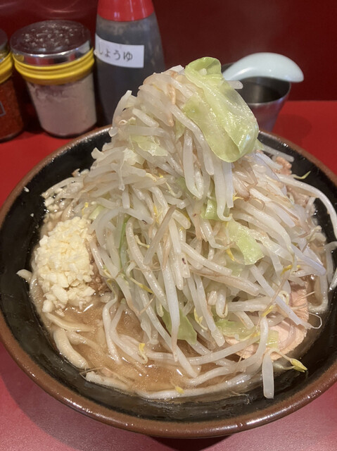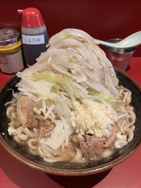 麺1/3、豚2枚にニンニク、野菜、アブラ+味玉。