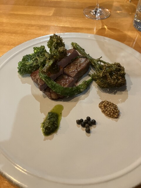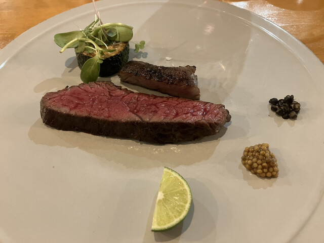本日は、前菜3品、パスタ、メインをオーダー。まずはシャンパンで乾杯。前菜は、ズワイ蟹とホタテのタルタルと根セロリのムース、つぶ貝とキノコの香草バター焼、そしてシェフお薦めの新潟県八色椎茸のソテーとラルドを注文。どれも秀逸で素晴らしい。八色椎茸は肉厚でジューシー、赤ワインが最高に合います。パスタはペコリーノチーズと黒胡椒のパスタをオーダー。濃厚なチーズに黒胡椒のスパイスが効いていて、これまた最高。メインは蝦夷鹿の炭焼き。肉の旨みが素晴らしく、赤ワインが進みます。感動の連続で次の訪問が楽しみです。