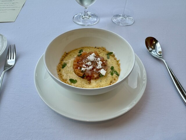スモークサーモンのタルタルはサーモンやムース、下に隠れたグリンピース、縁取るように飾られたパン粉のクリスピーな食感が混じり合って、食べてて楽しかったです。