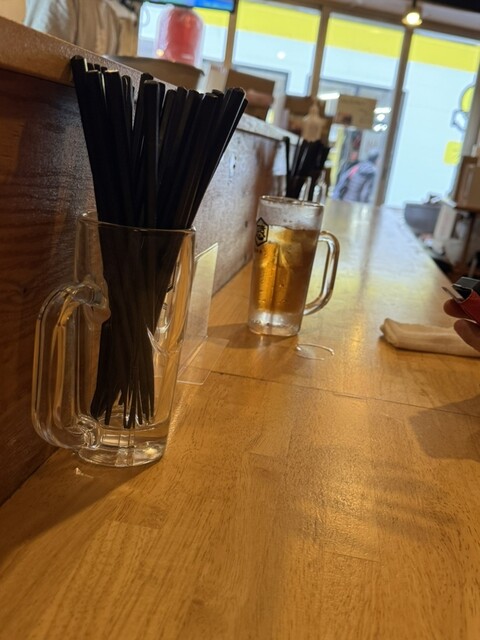 店内は前回と同じ印象の壁に絵が描かれた沙汰な感じのまんま居酒屋の、今日現在厨房向きL字カウンター8席のみで暖かいおしぼりと氷入り麦茶はジョッキで出して頂きました。(壁側にハンガー掛け、壁下に荷物置き場、奥突き当たりにお手洗いあり)。