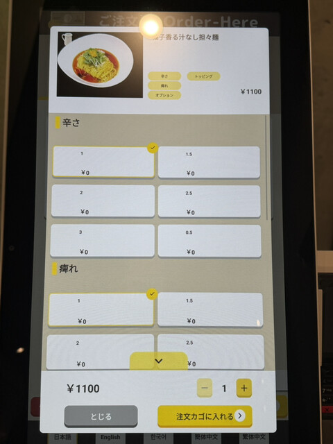 食券購入時、タッチパネルで辛さを0.5〜3からと痺れを0〜3から0.5刻みで選べるとの事なので両方とも1でオーダー。