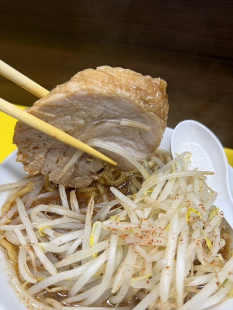 具は噛みごたえある厚切り豚バラチャーシュー1枚にシャキシャキ茹でもやしとキャベツ、味付き大粒背脂に刻みニンニク等です。