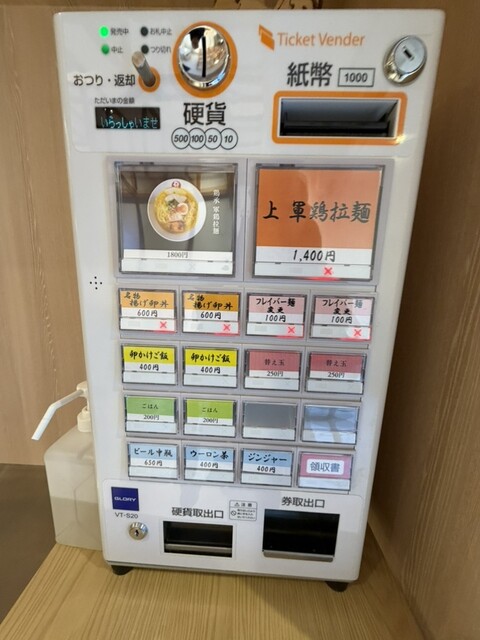 さて年内はプレオープン期間中でメニューは鶏承 軍鶏ラーメン1800円のみなので今回はそちらを入って右側の新札対応券売機にて発券(現在現金のみ!キャッシュレス決済は準備中)。