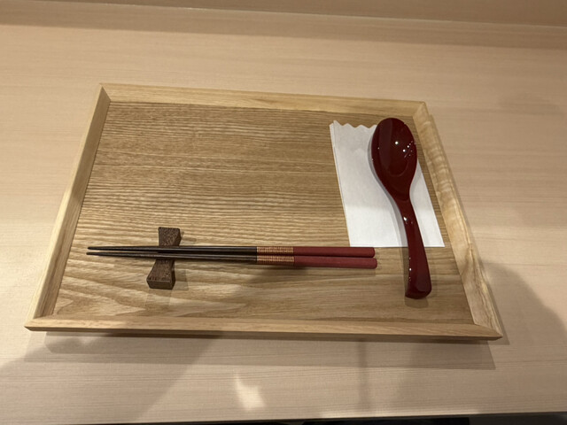 卓上の木のお盆にセットされた朱塗りのお箸とレンゲ、紙ナプキン