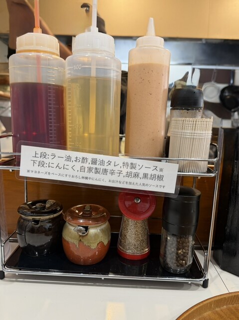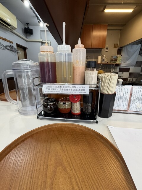 卓上にはお水ピッチャー、お茶のポットコップ、丸い木のお盆、割り箸、楊枝が備えてあり(ティッシュはカウンター下、)調味料はブラックペッパーミル、お酢、醤油ダレ、ラー油、ニンニク、胡麻、唐辛子調味料、特製ソースがあります。