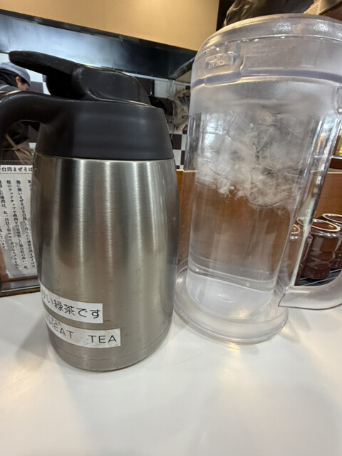 卓上のお水ピッチャーと温かいお茶ポット