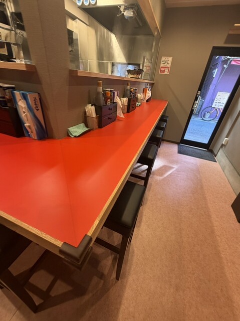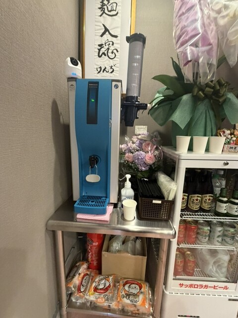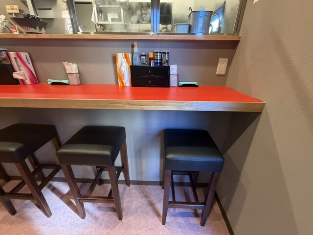 店内はグレー基調で落ち着いた、今日現在厨房向きL字カウンター8席のみでお水は入って奥正面の冷水機にてセルフですが今日は出して頂きました(壁側に荷物用フック、入って奥右側にお手洗いあり)。