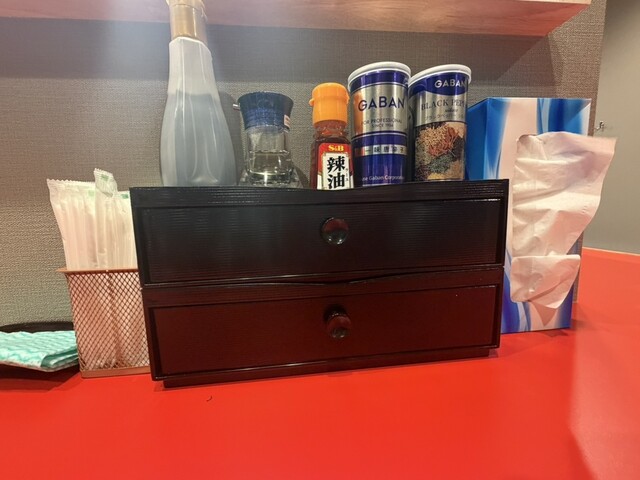 卓上にはケースに入った楊枝入り割り箸とレンゲ、ボックスティッシュ、紙おしぼりが備えてあり(紙エプロンは冷水機右脇)調味料はギャバンブラックペッパーと一味唐辛子、醤油、お酢、ラー油があります。