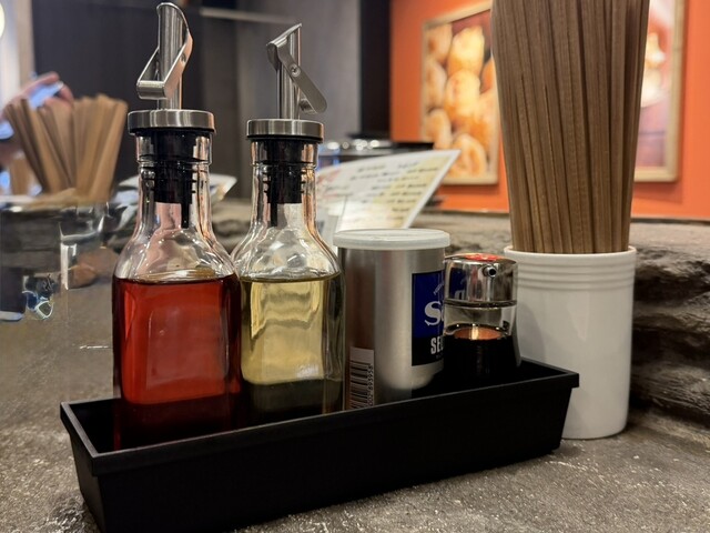 卓上にはメニュー、竹の割り箸、紙ナプキンが備えてあり(楊枝は冷水タンク上)調味料はエスビーブラックペッパー、醤油、お酢、自家製ラー油?があります。