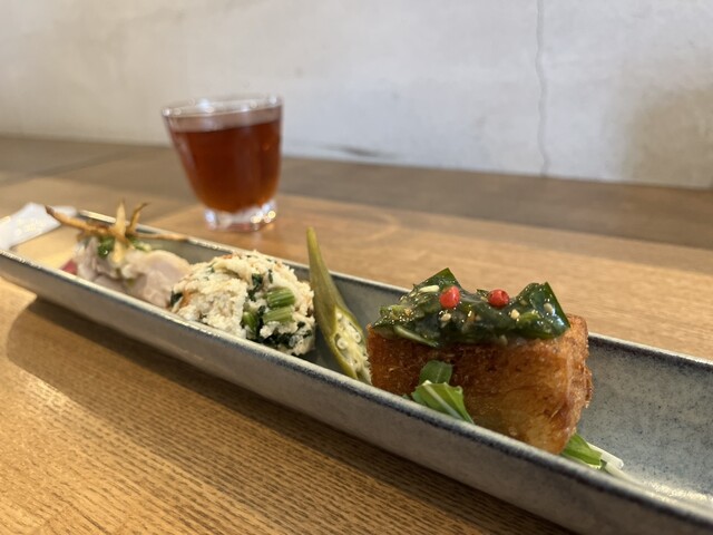前菜は中華風おから、蒸し鶏、大根餅の3種。