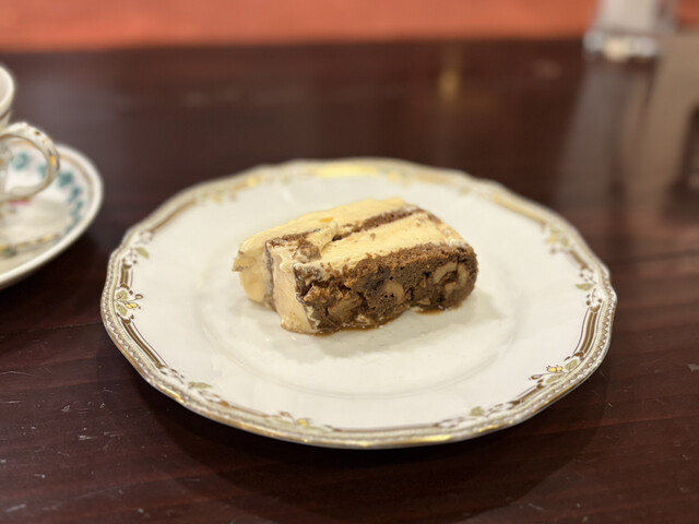 ホシヤマチーズケーキはラム酒の効いたトロトロのクリームと珈琲を染み込ませたスポンジでに胡桃?ナッツが入っていて食べて幸せを感じるケーキで、注文して正解。