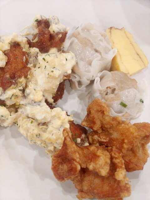 この日は、チーズダッカルビ、だし巻き玉子、シュウマイ、チキン南蛮、から揚げ、アジフライ、白身フライ、フライドポテト、生卵や海苔なんかもある。