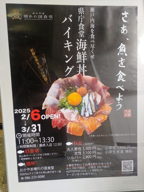 岡山県庁にある食堂で、海鮮丼が時間内であれば無制限で食べ放題という企画があることを知り、この度満を持して行ってきた。